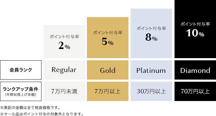 会員ランクは、毎年4月1日から翌年3月31日までの1年間にご購入いただいた商品代金(税抜き)の合計を基準に判定を行います。(例:2021年4月1日~2022年3月31日までの累計ご購入金額 ⇒ 2022年4月1日にランク判定)