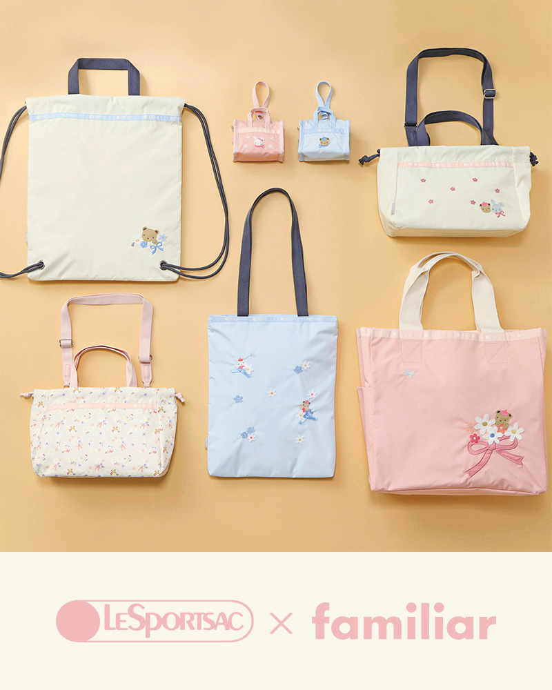 LeSportsac×familiar 2026年3月25日(水)発売 販売に関する大切なお知らせ 神戸発のベビー・子ども関連ブランド「familiar」とのコラボレーション。第4弾となる今回は「フラワー」をテーマに春の新生活を華やかに彩るラインナップ。 LeSportsac×familiarをすべて見る POINT < オリジナルプリント> 春らしいお花とクマとウサギのオリジナルプリントが誕生!リバーシブルトートとショルダーバッグに使用しています。 LINE UP LG REVERSIBLE TOTE ファミリアブルームリバーシブルトート ¥46,200 パステルピンクにお花とクマの刺しゅうを施した春らしいでデザインと、オリジナルプリントをリバーシブルで楽しめるトートバッグ。 両面にあるサイドポケットは500mlのボトルや折りたたみ傘が入る大きさ。すぐに取り出したいスマホなどの収納にも便利です。 TH TOWN KNAPSACK ファミリアアイボリーナップザック ¥36,300 お花とクマのかわいらしい刺しゅうがポイントの軽量ナップサック。中にはA4サイズが入るクッション入りのポケット付きでノートPCやタブレット、教科書を収納できます。 E/W TOWN DRAWSTRING BAG ファミリアアイボリードローストリング ¥36,300 E/W TOWN DRAWSTRING BAG ファミリアスプリングブルーム ¥36,300 巾着型のショルダーバッグ。取り外し可能なショルダーストラップ付きで、手持ち、肩掛け、クロスボディの3WAYでお持ちいただけます。クマとウサギの刺しゅうデザインとオリジナルプリントの2色展開。 VERTICAL TOWN TOTE ファミリアブルーバーティカルトート ¥30,800 スリムな縦型トートバッグ。A4サイズやノートPCなどを仕分けて収納できるスナップボタン付きのポケットがあり、通勤や通学におすすめです。 MICRO WEEKENDER CHARM ファミリアブルーチャーム ¥15,400 MICRO WEEKENDER CHARM ファミリアピンクチャーム ¥15,400 イヤホンやリップ、キャンディなどを可愛く収納できるミニバッグ型のチャーム。クマとウサギの2色をラインナップ。