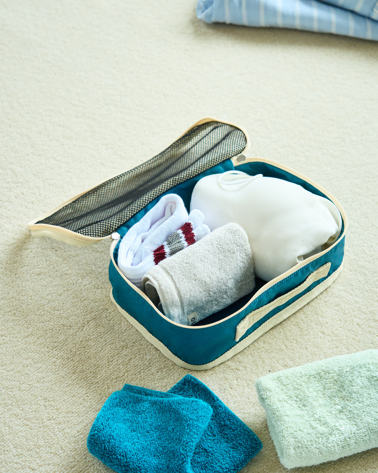 ポーチの上面はメッシュ素材になっていて中身が見やすいのもポイント。ボストンバッグやラゲッジにきれいに収納できます。